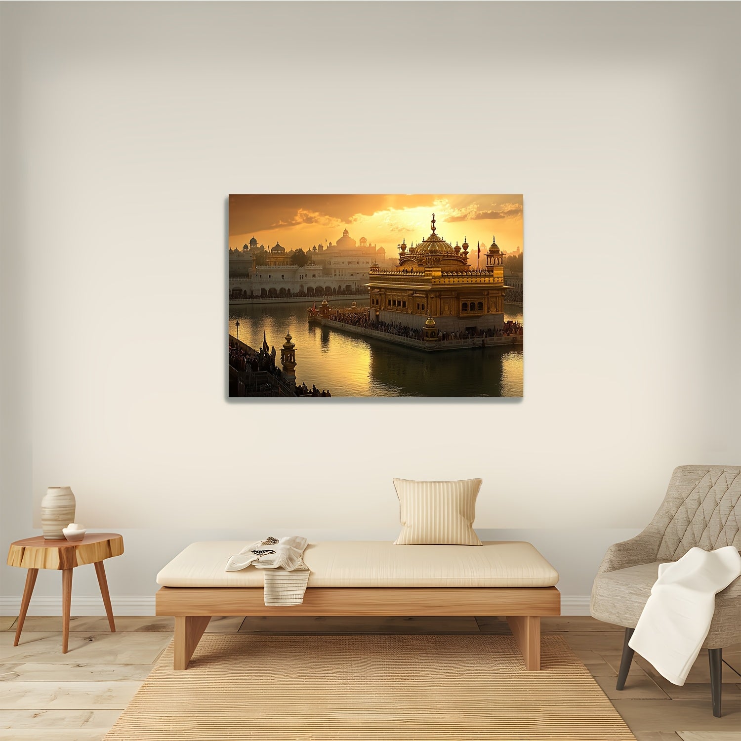 Bringen Sie spirituelle Ruhe und kulturelle Schönheit in Ihr Zuhause mit diesem eindrucksvollen, extra großen Leinwandbild des Goldenen Tempels (Harmandir Sahib) bei Sonnenuntergang. Das Design ist inspiriert von der heiligen Atmosphäre von Amritsar und Anandpur Sahib und vereint traditionelle Sikh-Architektur mit moderner, minimalistischer Ästhetik.